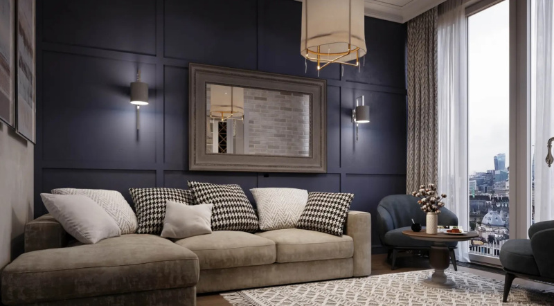 Классический синий, темно-синий и темно-зеленый — самые актуальные цвета интерьера на 2024 год. Эти оттенки особенно хорошо подходят для больших просторных помещений. В маленьких помещениях темные цвета лучше использовать в качестве акцентов и разбавлять светлыми цветами той же палитры.